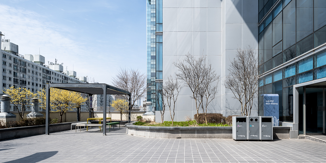 도심 속에서 생활 속 여유와 휴식을 취할 수 있는 자연 쉼터. 마당 한편에는 리사이클 공간이 마련되어 있습니다. 환경을 중시하며 고객님들에게 편리함을 제공합니다.